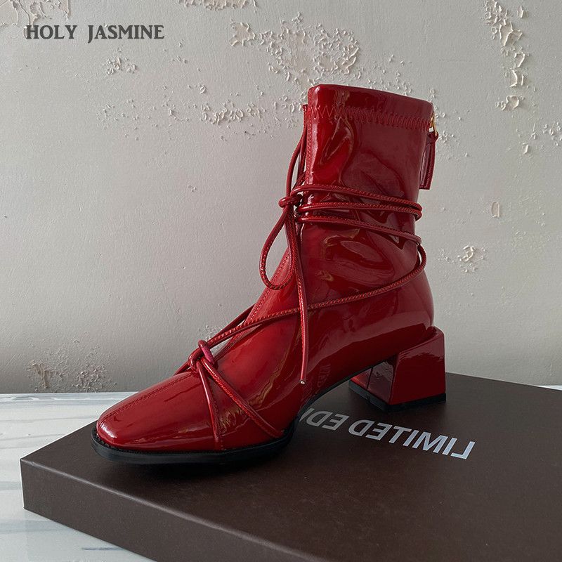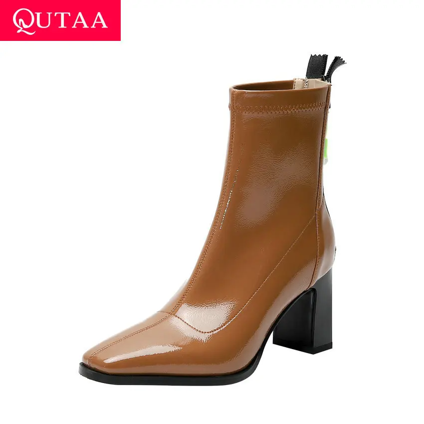 Qutaa 2021 Square High Heel Ankle Boots Stretch Pu Patent Leather Zipper Women Shoe Autumn Winter Fashion Ladies Pumps Size34 39 Ankle Boots Aliexpress