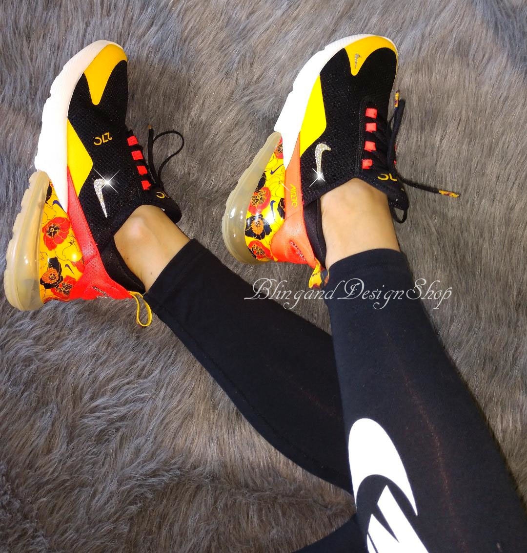 Swarovski Nike Air Max 270 Shoes Dark Stucco Metallic Gold Sail Customized With Rose Gold Swarovski Crystals Sneakers Fashion Sneakers Nike Gold