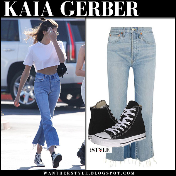 I Want Her Style What Celebrities Wore And Where To Buy It Celebrity Style Kaia Gerber In White Cropped Top And Cropped Flared Jeans In Malibu On December 28