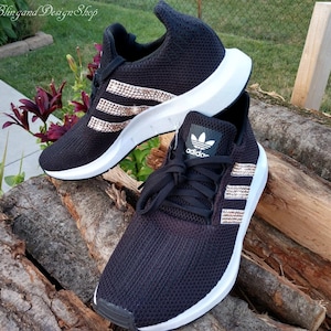 Womens Adidas Swift Run Casual Shoes With Rose Gold Swarovski Crystals On Stripes